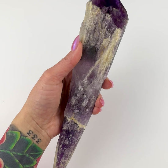 This 10.1" × 2.1" Bahia Amethyst Semi-Polished Wand is an impressive, statement-sized piece full of bold color, and powerful presence. The semi-polished finish gives it the perfect blend of natural texture and shine, allowing its unique patterns and zoning to stand out beautifully.