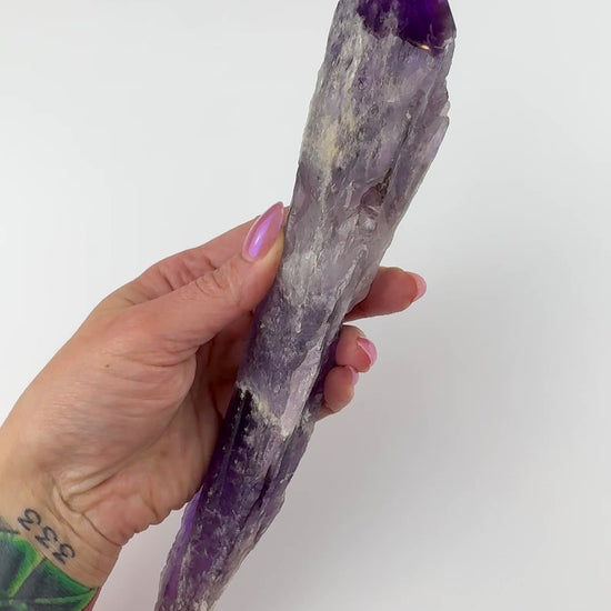 This 10" × 2" Bahia Amethyst Semi-Polished Wand is an impressive, statement-sized piece full of bold color, and powerful presence. The semi-polished finish gives it the perfect blend of natural texture and shine, allowing its unique patterns and zoning to stand out beautifully.