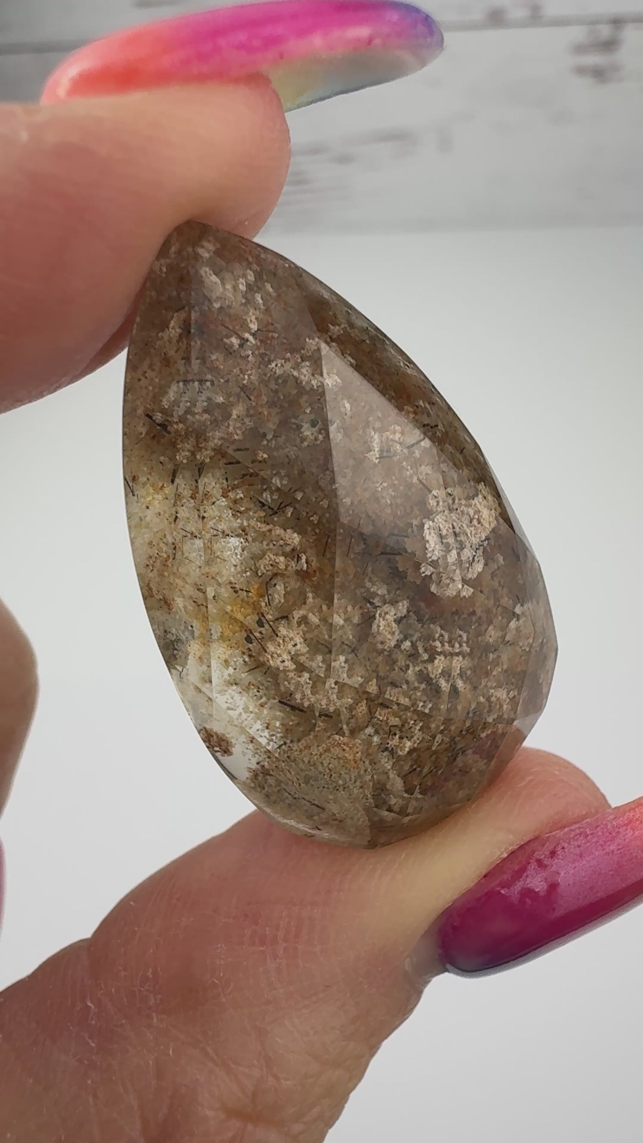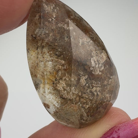 You will just love this high quality teardrop shaped Lodolite Cabochon from Brazil. It is 20 x 33mm with a height of 10mm. This one has a beautiful faceted top which really reflects the natural inclusions.