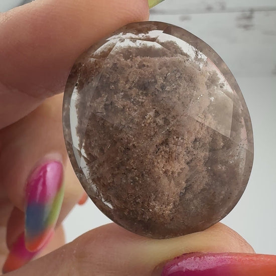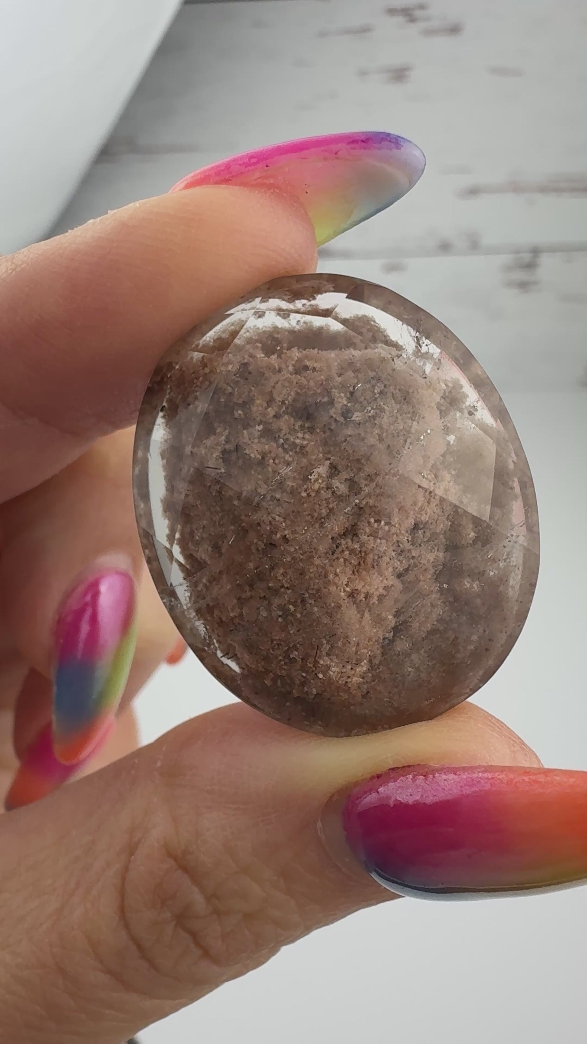 You will just love this high quality oval shaped Lodolite Cabochon from Brazil. It is 27 x 3mm with a height of 12mm. This one has a beautiful faceted top which really reflects the natural inclusions.