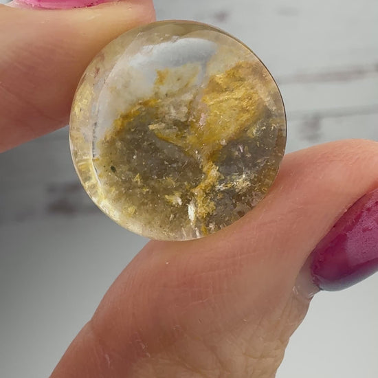You will just love this high quality Lodolite Cabochon from Brazil. It is 18mm round with a height of 9.5mm. This one has Pretty iron inclusions as well as foil flashes.