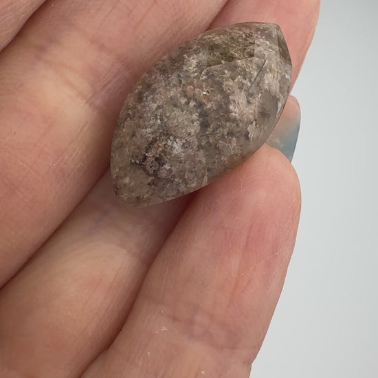 You’ll love this high-quality marquise-shaped Lodolite cabochon from Brazil. It measures 13 x 26mm with a height of 8mm, and features a beautifully faceted top that catches the light and highlights its natural inclusions. Each piece is like a tiny world within itself—earthy, ethereal, and full of depth.