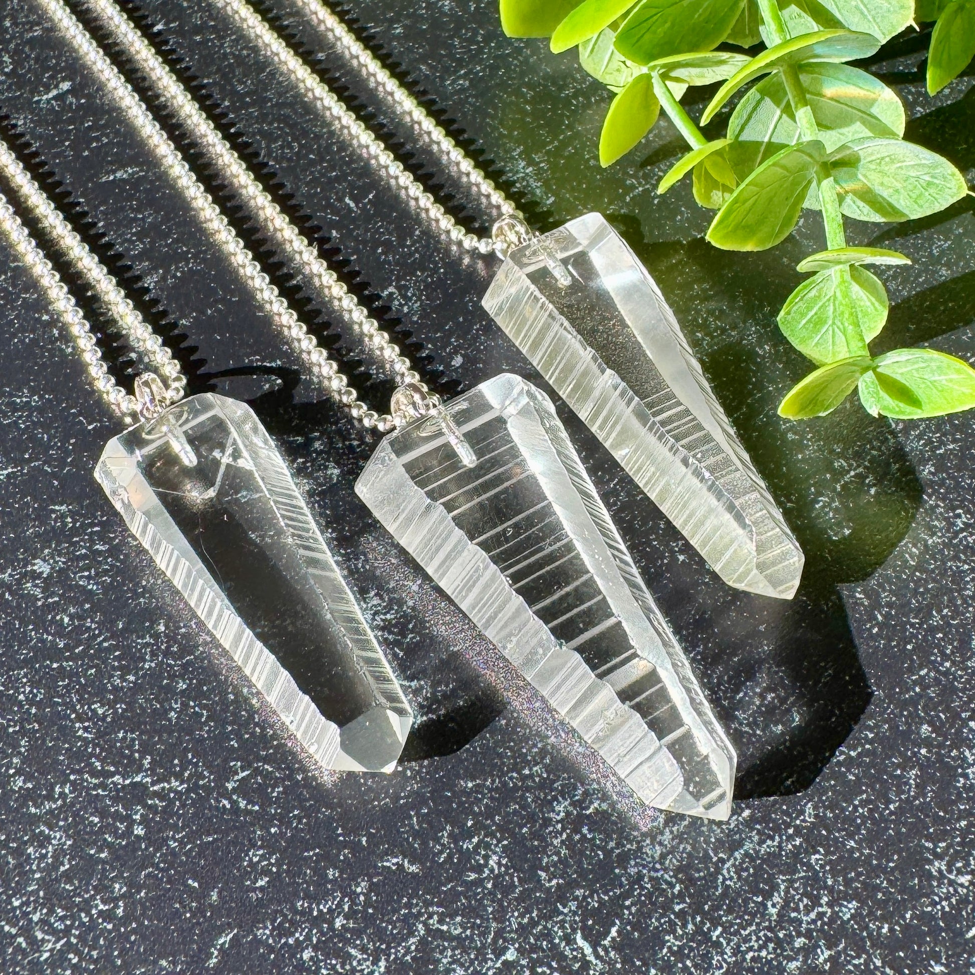 Each pendant necklace is intuitively chosen and one-of-a-kind, measuring approximately 1.1–1.75 inches long and 0.4–0.65 inches wide. Handcrafted from ethically sourced Lemurian Quartz mined in Diamantina, Brazil.