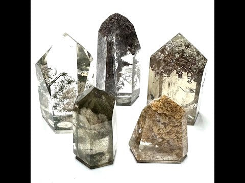 Magical Lodolite Quartz mini tower stone lot. These 5 natural Lodolite Quartz towers range in height from 1 -1 1/2". Lodolite, also known as Garden or Shaman Quartz, is a type of Quartz with mineral inclusions that give the appearance of a garden or a lunar landscape within. The colors included can be brown, orange, cream, green or red. Check out the additional pictures and video for a closer look!