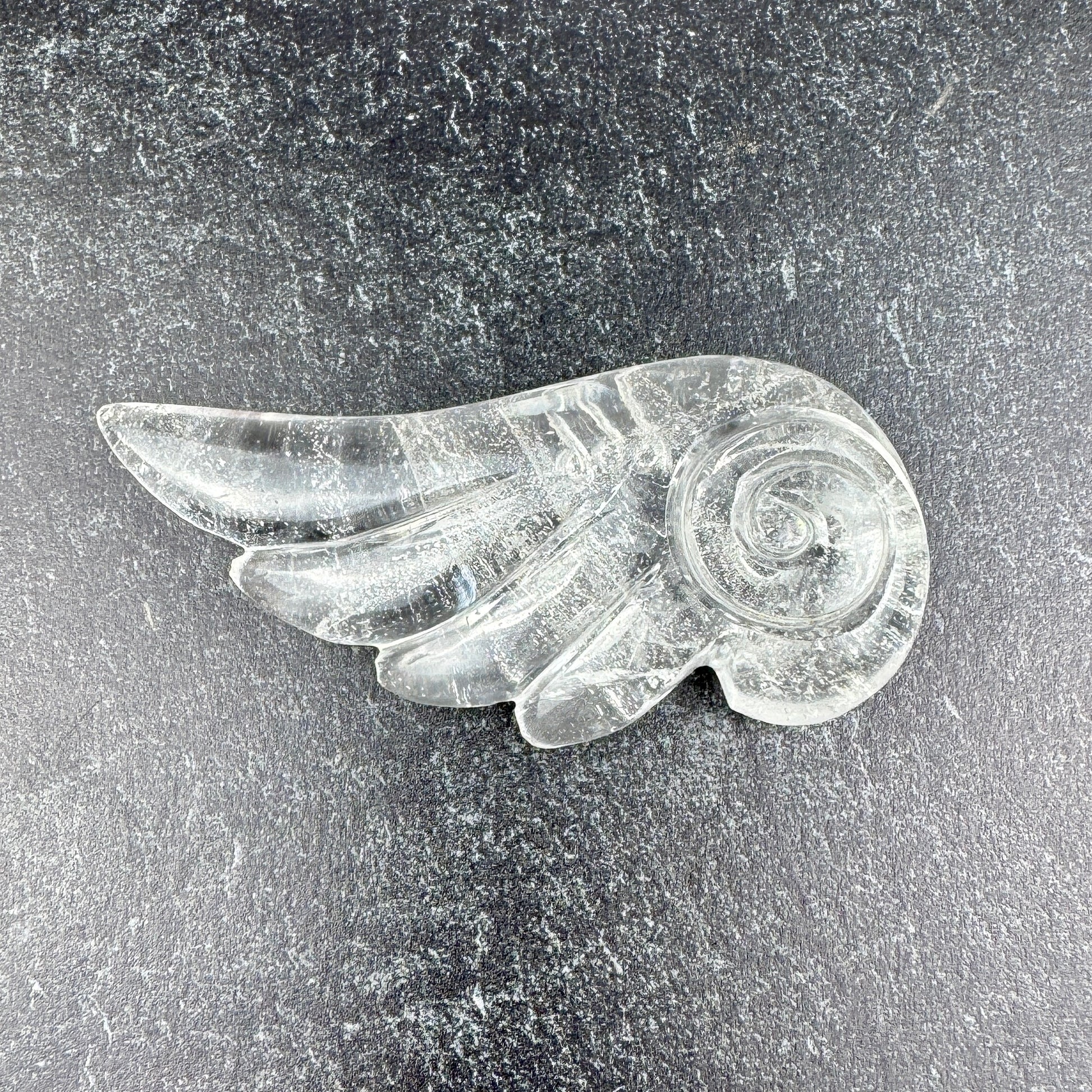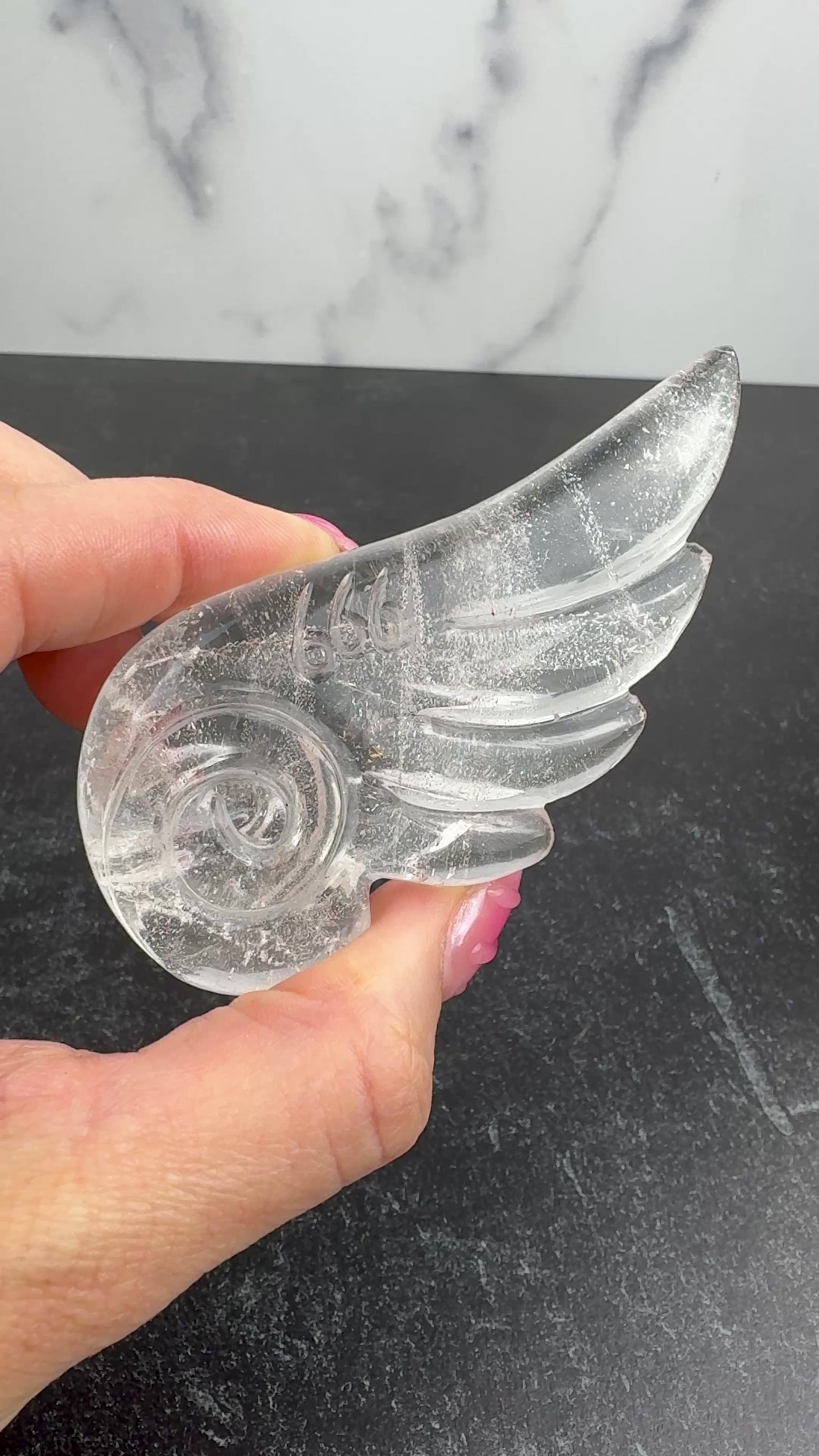 This is a one of a kind Master Carved Agate Angel Wing by Vikas Meena. Himalayan Quartz is a special type of quartz crystal that is found in the Himalayan Mountains. This carving is 3 1/2 x 1 3/4" with a 17mm thickness. It's a nice size to hold in the hand particularly during meditation. The Angel Number 666 is hand carved on one side of the crystal with swirl symbol which is a symbol of infinity & continuity, representing the endless cycles of life, nature and the universe. Lauren has worked very hard on this design. We are so happy to bring this exclusive angel wing collection to you!