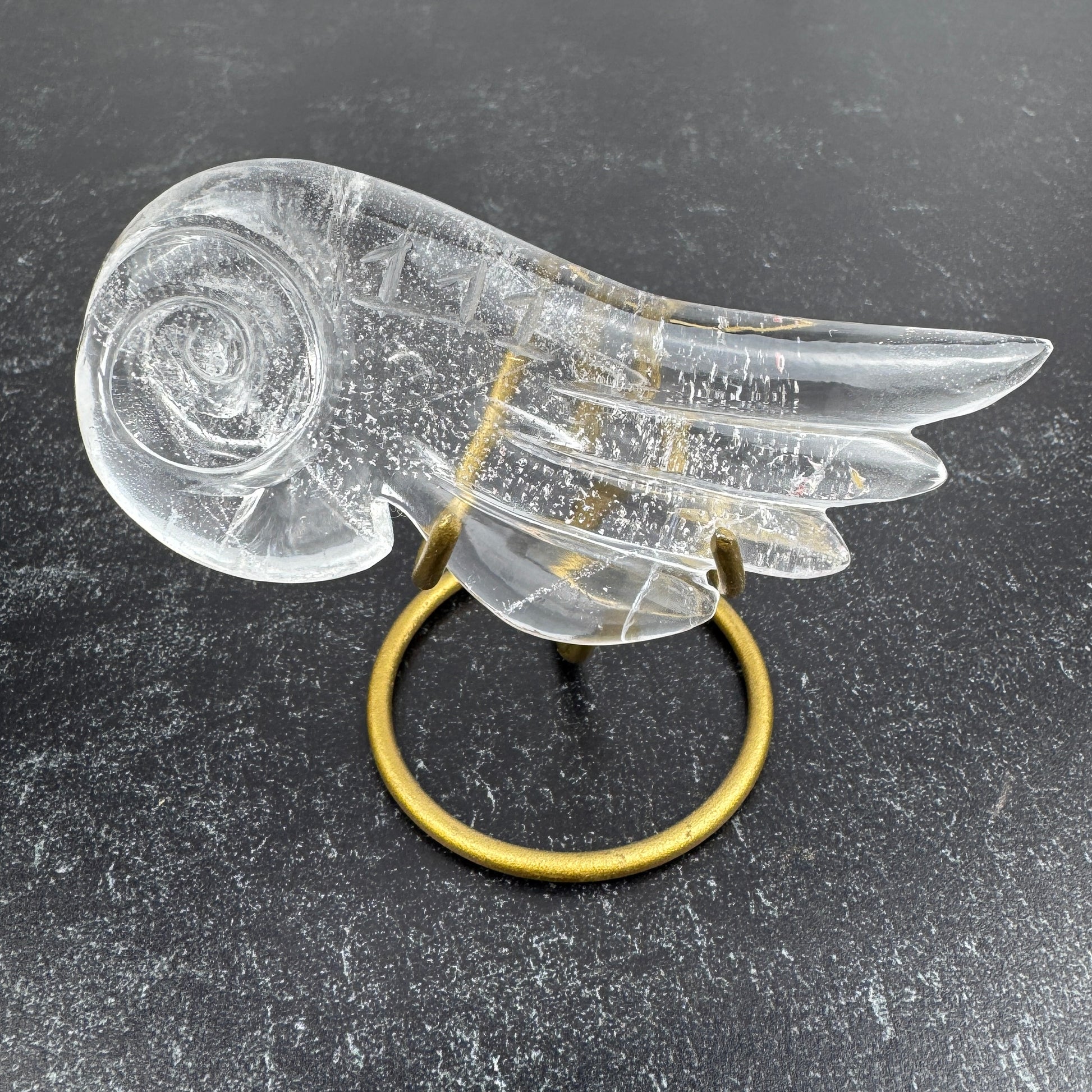 This is a one of a kind Master Carved Agate Angel Wing by Vikas Meena. Himalayan Quartz is a special type of quartz crystal that is found in the Himalayan Mountains.This carving is 3 1/4 x 1 1/2" with a 16mm thickness. It's a nice size to hold in the hand particularly during meditation. The Angel Number 111 is hand carved on one side of the crystal with swirl symbol which is a symbol of infinity & continuity, representing the endless cycles of life, nature and the universe. Lauren has worked very hard on this design. We are so happy to bring this exclusive angel wing collection to you!