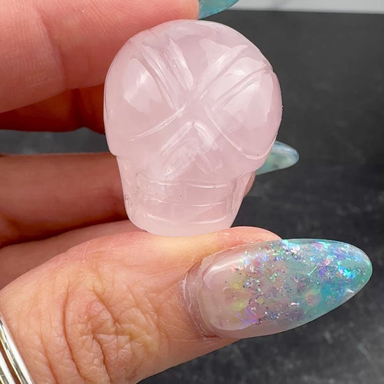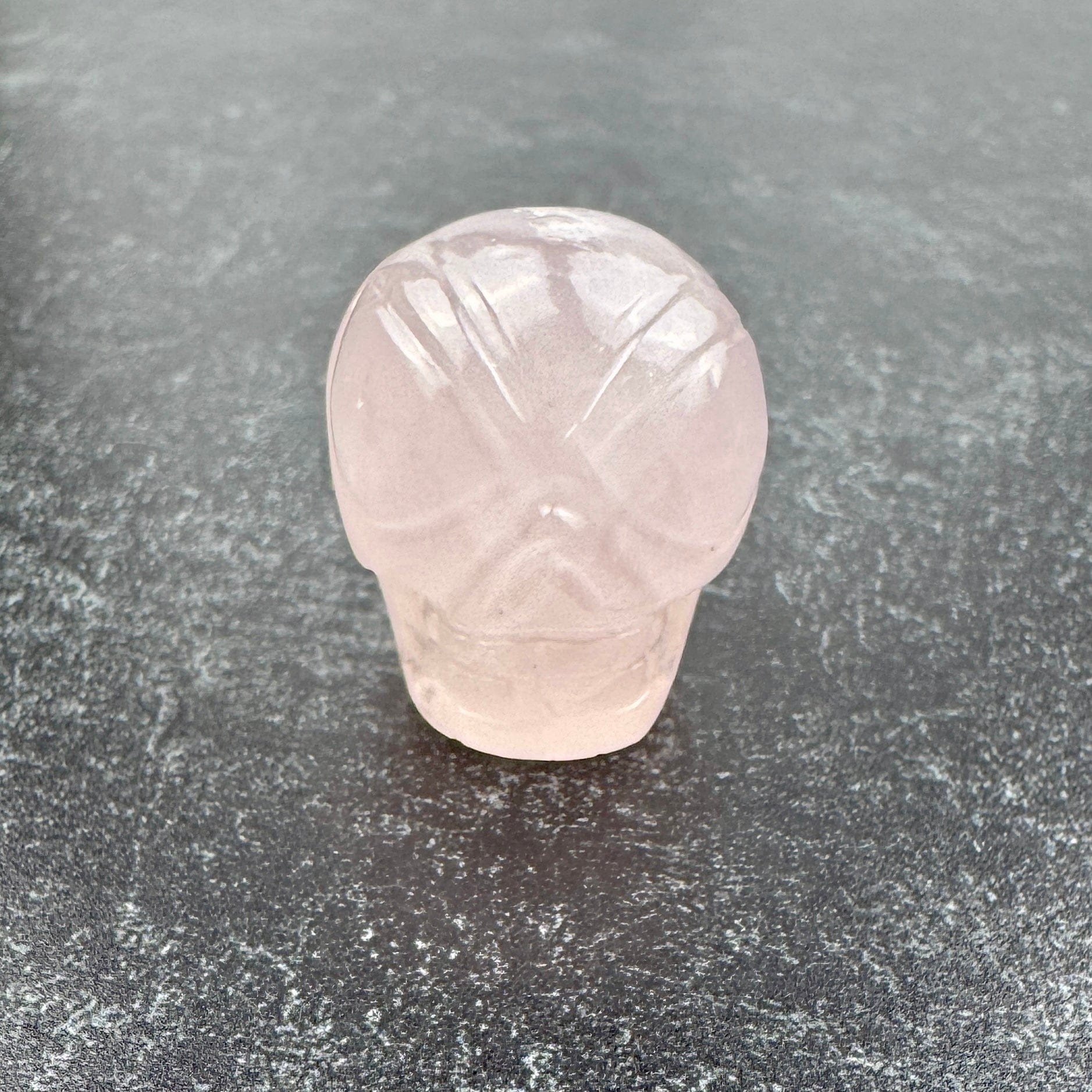 This rose quartz Cosmic Angel skull #111 is master carved by Vikas Meena. The details in the carving are out of this world. The size is 23 x 26 x 26mm thickness. The Angel Number 111 is hand carved on the backside. This Rose Quartz cosmic carving is a metaphysical and artistic carving with a celestial or extraterrestrial like figure associated with high consciousness, galactic wisdom, and inter-dimensional energy.    We are thrilled to introduce this exclusive collaborative to our Angel number collection.