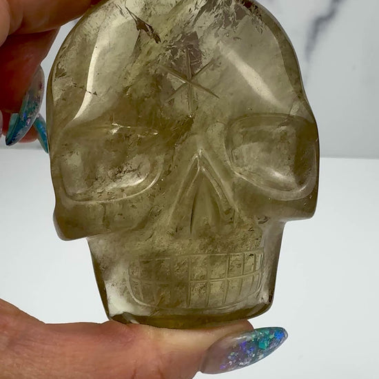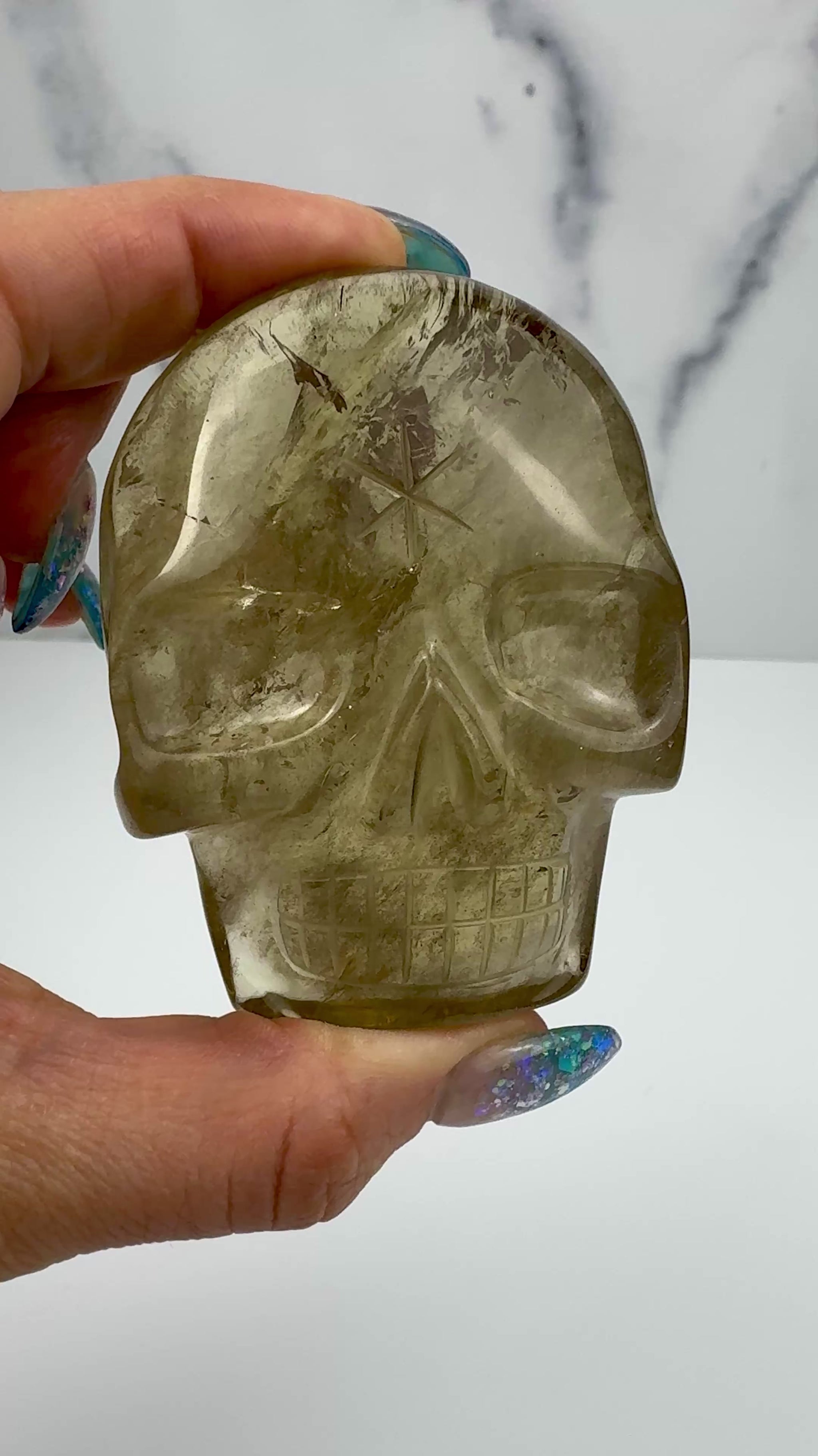 AGOS Exclusive Smokey Quartz Standing Palm Skull Angel NumberCollection - Master Carved by Vanderlei Baretto. This one of a kind angel skull carving is 2 1/4" x  3/4 x 2 3/4" approximately. The Angel #888 is carved on the backside and a star carved third eye. This one fits nicely in the hand and can stand as well. Bonus for display.