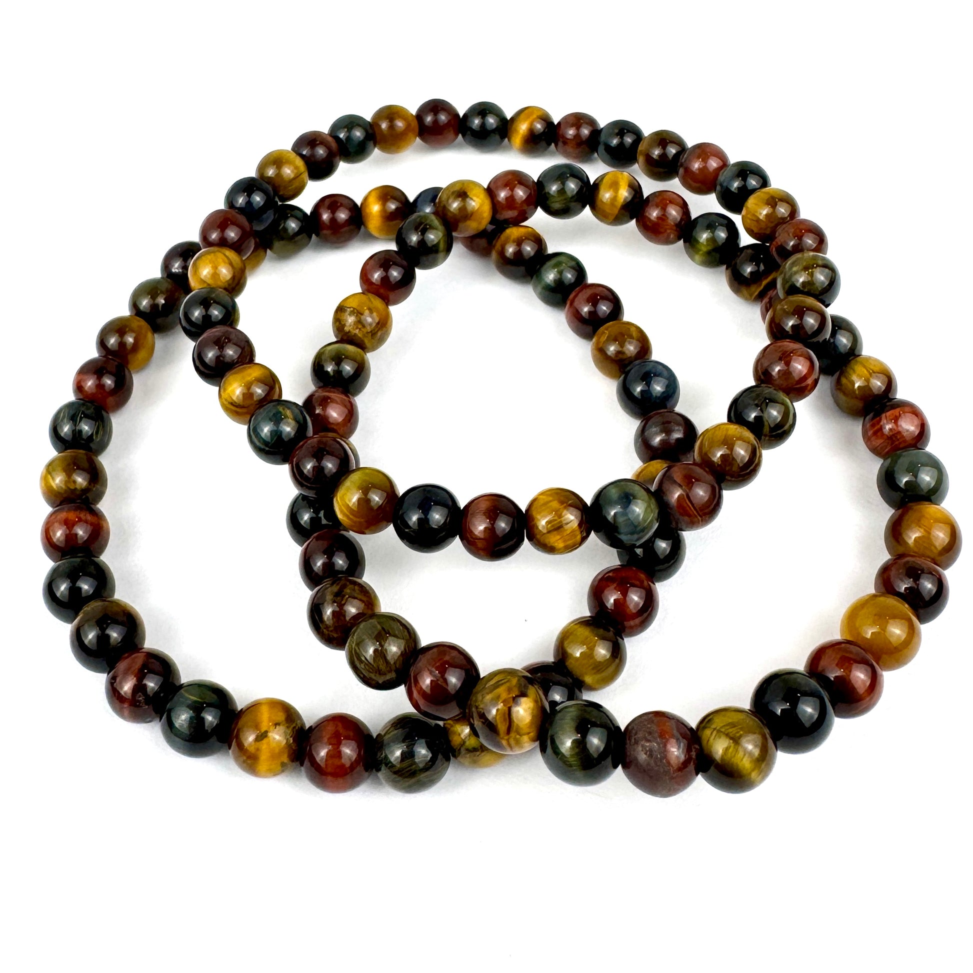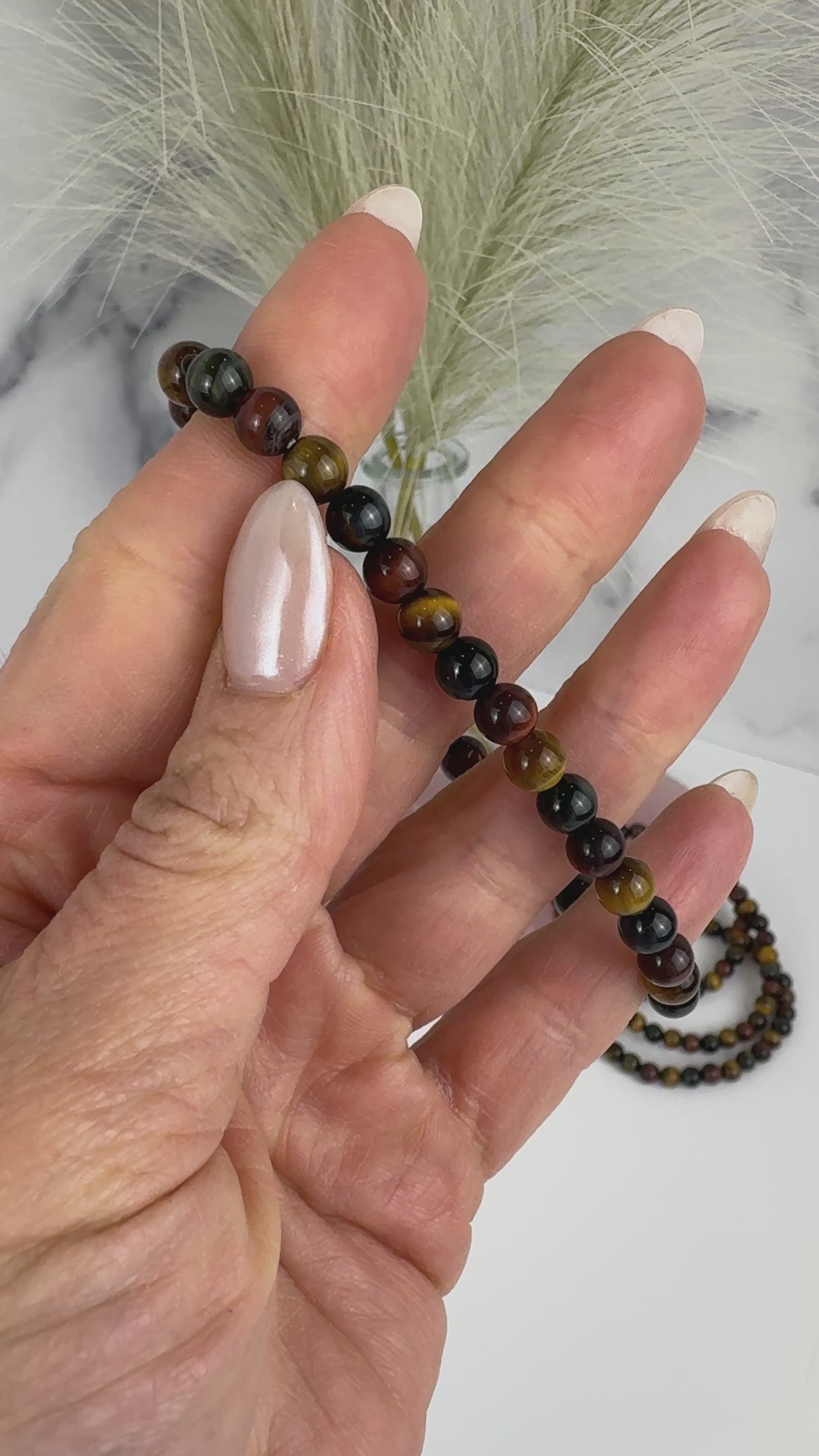 Captivating Multicolored 6mm Tiger Eye mala bracelet is an amazing choice for those who appreciate the beauty and symbolism of this unique gemstone. Tiger Eye is known for its shimmering bands of color and is often used for its protective and grounding properties to mention just a few.  The color range of each bracelet is a variety of golden yellow, rich browns and even shades of blue and red. The mesmerizing chatoyancy or "cat's eye" effect, creates a dynamic, shifting light pattern across the surface of the beads.  Mala bead bracelets are used in both meditation and prayer. Like a rosary, each bead represents a mantra or prayer. Smooth to the touch, Mala beads help you to remain focus by being a tactile reminder of what you are meant to be doing; meditating or praying.