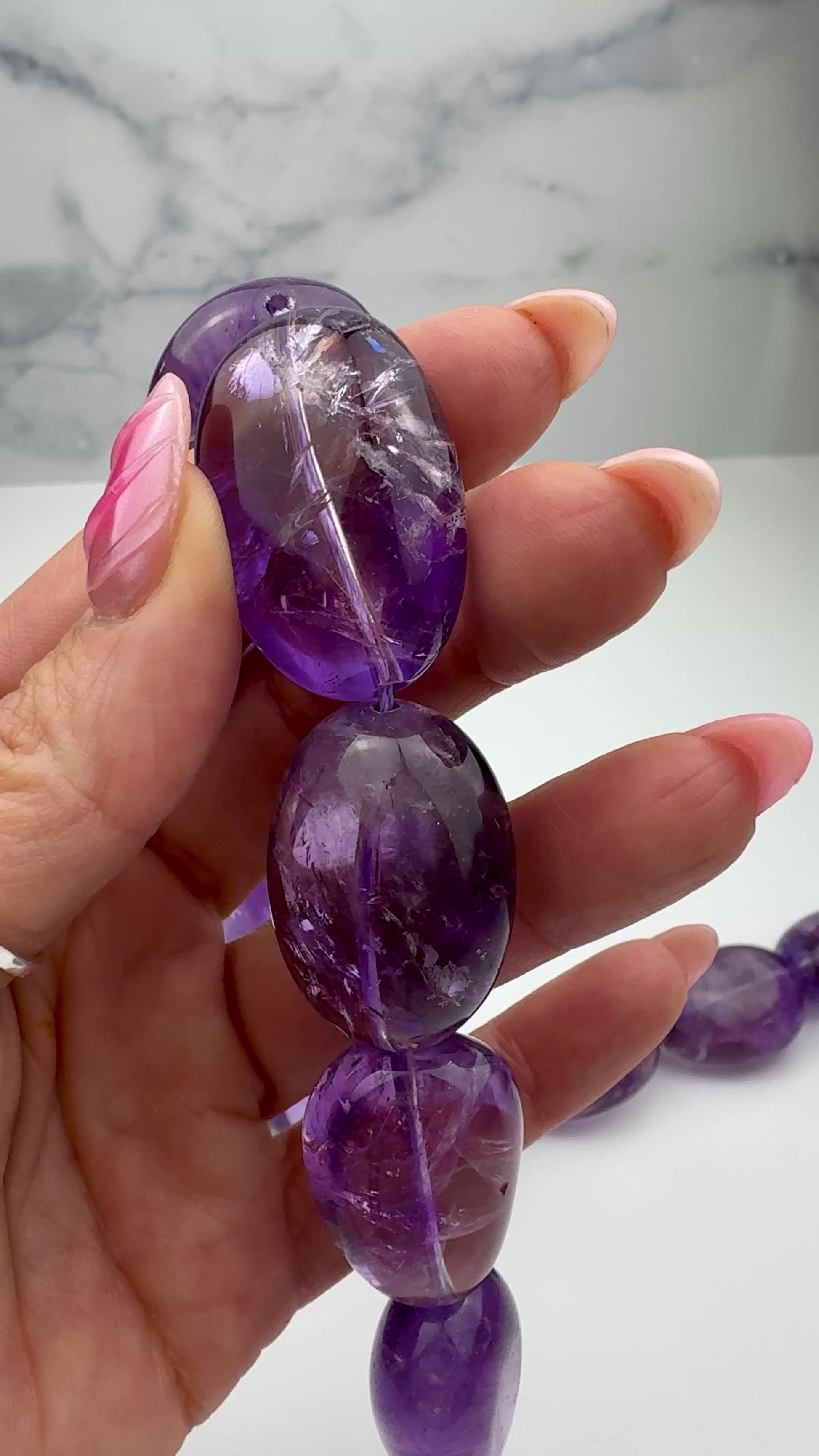 This one-of-a-kind high quality AA grade Amethyst strand of beads is a show stopper! The strand is graduated from 29-39mm. You get the exact strand shown in the image. The exquisite natural purple hues and captivating shapes of this strand elevate it to perfection, ideal for creating breathtaking high-end jewelry designs that inspire elegance.