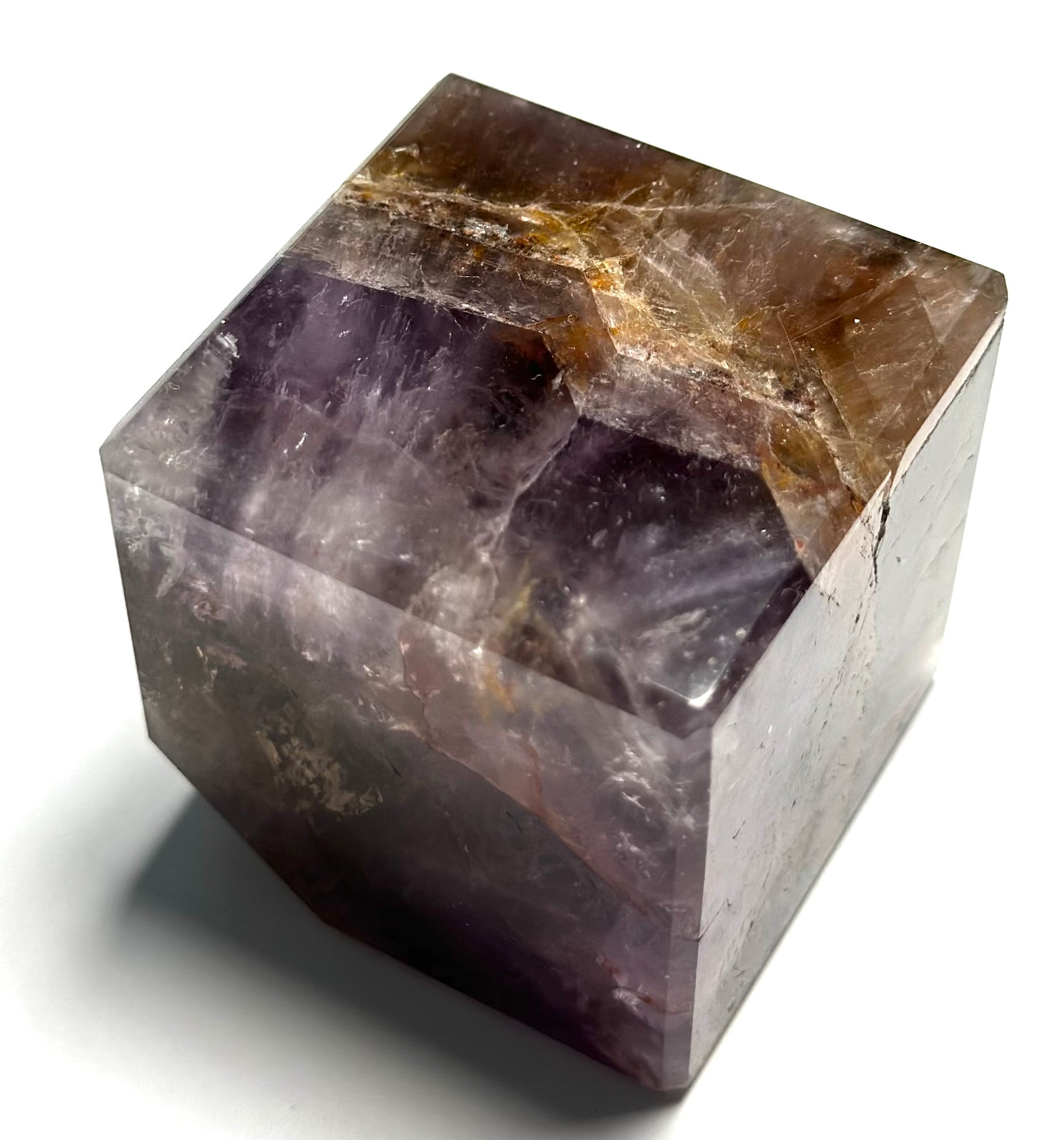 Polished to a high gloss, this cube showcases depth, dimension, and remarkable clarity. The precision-cut corner adds a sculptural element, transforming it from a mineral specimen into a true display piece.