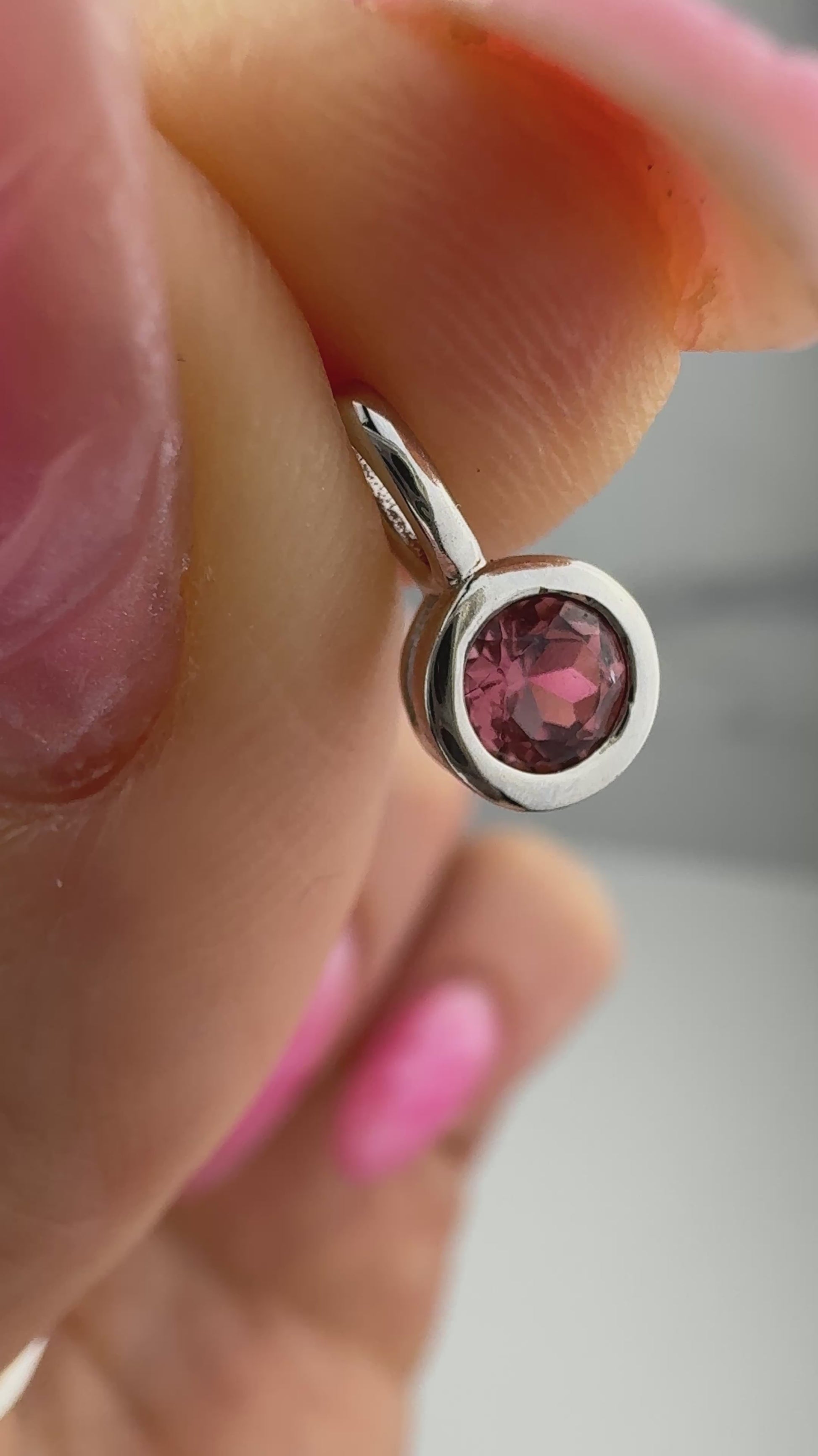 This 4mm dainty Pink Tourmaline pendant is AAA grade. The brilliantly faceted 4mm stone is set in a sterling silver bezel. The silver has a touch of rhodium to prevent tarnish.