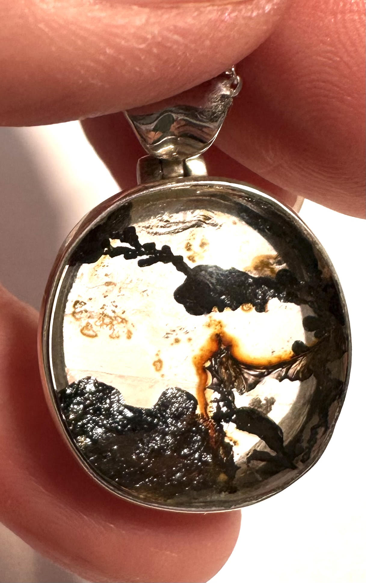 This beauty has hematite inclusions which is more rare and amazing. Set in a round bezel setting with the hinged sterling silver bail. Naturally mesmerizing, this dendritic quartz pendant captures the quiet beauty of nature within stone. Sourced from Brazil, the quartz reveals intricate, tree-like inclusions—each one completely unique, like a miniature landscape frozen in time.