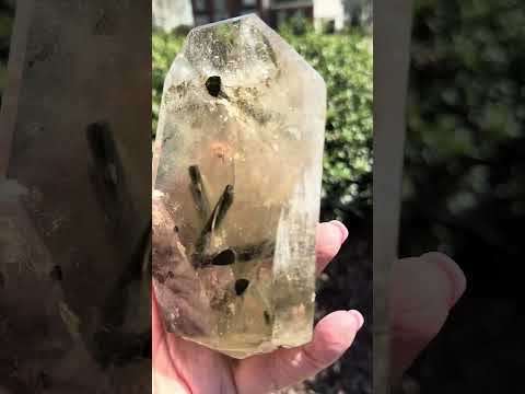RARE-Wow what a beauty. One of a kind Green Tourmalinated Smokey Quartz point with stand. This magnificent Tourmalinated Smokey Quartz point measures 5 1/4 x 3 1/4 and is partially polished. The matte black metal stand measures 6 1/4" and 8" with the stone. Tourmalinated Quartz is one of the most powerful cleansing stones. It clears negativity and is said to cleanse one's aura while restoring balance and well-being. Smokey Quartz gets its name from its natural smoke color. Smokey Quartz can range in color from a light grey to a more deep earthy smoke brown. Smokey Quartz is known as the stone of power. It provides a shield against psychic attacks, emotional and environmental stress, and is used extensively in healing and meditation. In addition to the Green Tourmaline this Smokey Quartz has beautiful rainbow inclusions. Rainbows are considered to be crystals of hidden joy and optimism. They help us see the beauty all around us and are useful in spiritual healing, meditation, and as talismans. Picture this beauty as an addition to your stone grid or as a display piece in your home. Please act fast, you don't want to miss out on this one of a kind natural Tourmalinated Smokey Quartz stone.