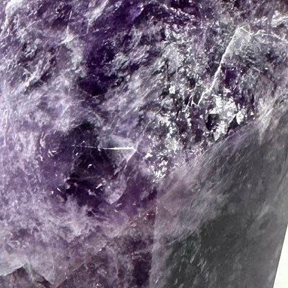 RARE-Magical Trapiche Amethyst terminated point. Mined in Brazil, this one of a kind Trapiche Amethyst stone measures 4 1/4 x 1 1/2" and is polished to perfection. The word "Trapiche" comes from a type of milling wheel that is used to process cane sugar.  Trapiche Amethyst was named after it because of its similar appearance in its growth patterns and inclusions to that of the spokes of the mill. Trapiche Amethysts have been found to have as many as 24 elements and minerals within. Amethyst stones are said to bring about courage and inner strength and have been used to protect against psychic attacks. On the spiritual level, the amethyst stone helps open the holder to communication with angels, telepathy and other psychic abilities. Rainbows are considered to be crystals of hidden joy and optimism. They help us see the beauty all around us and are useful in spiritual healing, meditation, and as talismans. Picture this rare beauty as an addition to your stone grid or as a display piece in your home. Please act fast, you don't want to miss out on this one of a kind natural Trapiche Amethyst stone.