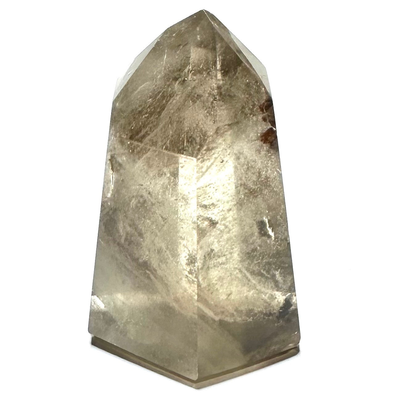 Magical Smokey Lodolite Quartz tower stone. This natural Smokey Lodolite Quartz stone measures 2" in height and 1 1/4" diameter at the base.Lodolite, also known as Garden or Shaman Quartz, is a type of Quartz with mineral inclusions that give the appearance of a garden or a lunar landscape within. The colors included can be brown, orange, cream, green or red. Check out the additional pictures for a closer look!