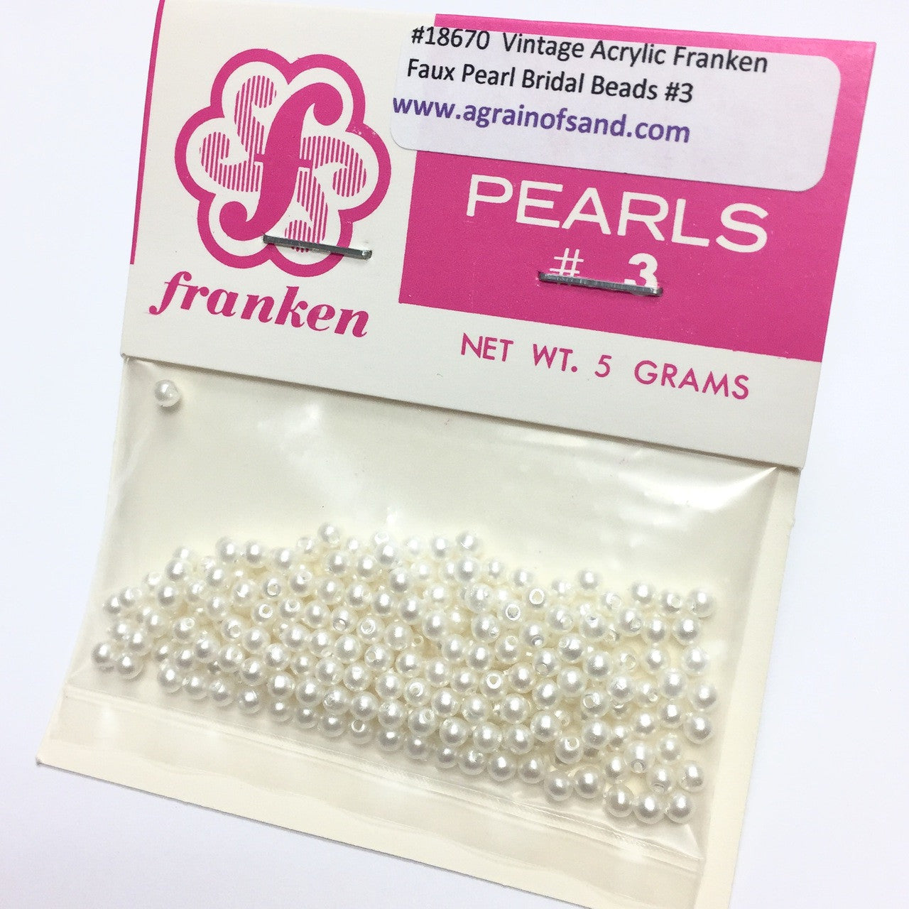 3mm round. These wonderful old goodies have been uncovered in their original factory packaging. Made in Japan for the Franken Trimming Company in NYC. This company has been out of business for years. But, these wonderful pearls have been nicely preserved. Each package has 5 grams of beads - approximately 275 beads. These pearl beads are perfect for bridal projects.  They were found in the famous vintage bead hoard.