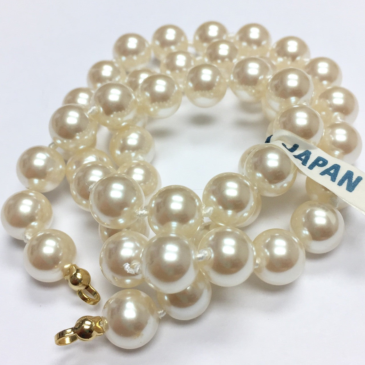 Rediscovered in the famous bead hoard! 17" knotted strand of sensational faux glass 8mm pearls. These are really stunning! From the 40's & "Made in Japan" Marked Kiska. All hand knotted with gold toned bead tips at the ends for easy finishing. These pearl beads are have been well preserved. Pristine uncirculated condition with luster to amaze the most fussy folks around. Simply add a stunning vintage clasp and ... .BAM... .you will have perfection at an unheard of cost.