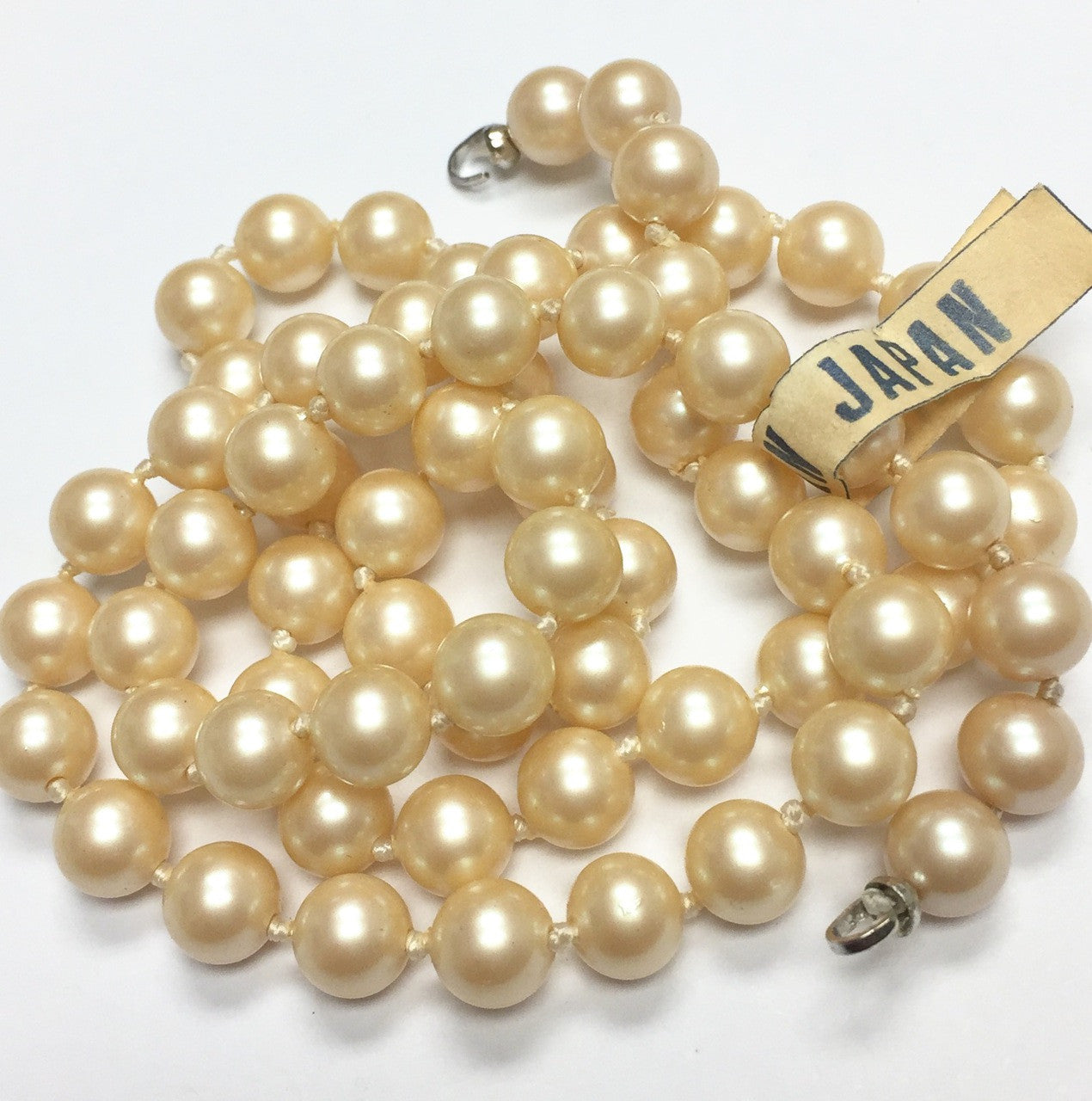 20" knotted strand of sensational glass faux 6mm pearls. These vintage faux pearl beads are really stunning! These pearl beads are from the 40's & "Made in Japan". Thay are all hand knotted with silver toned bead tips at the ends for easy finishing. Simply add a stunning vintage clasp to this glass pearl bead strand and ... .BAM... .you will have perfection at an unheard of cost.
